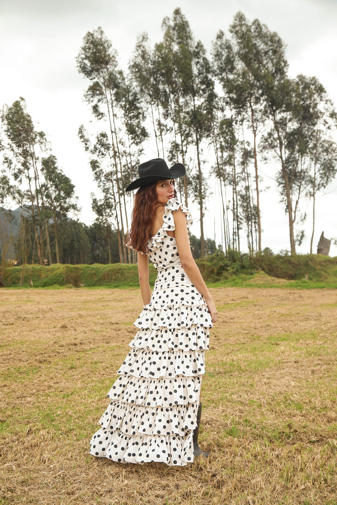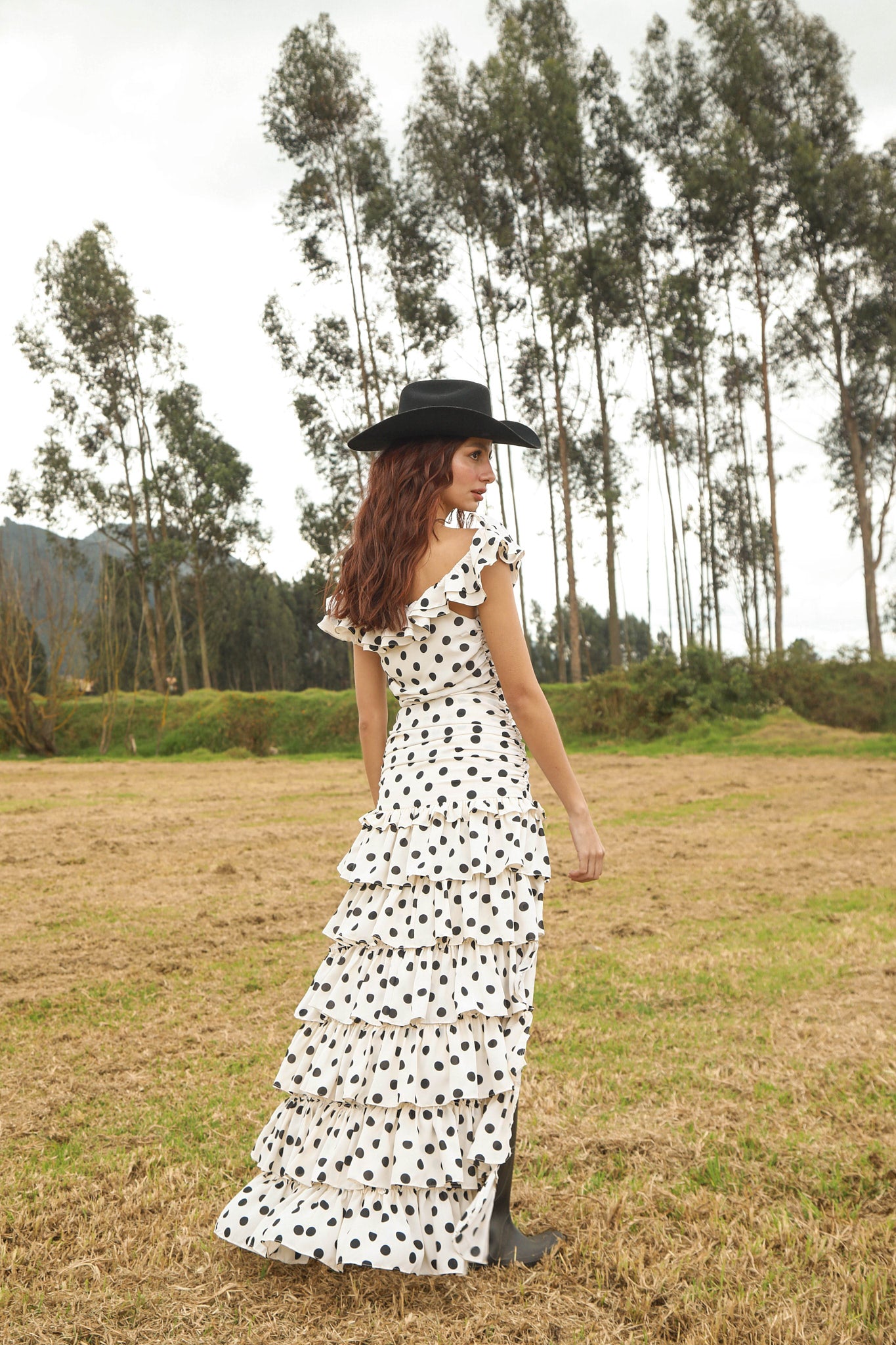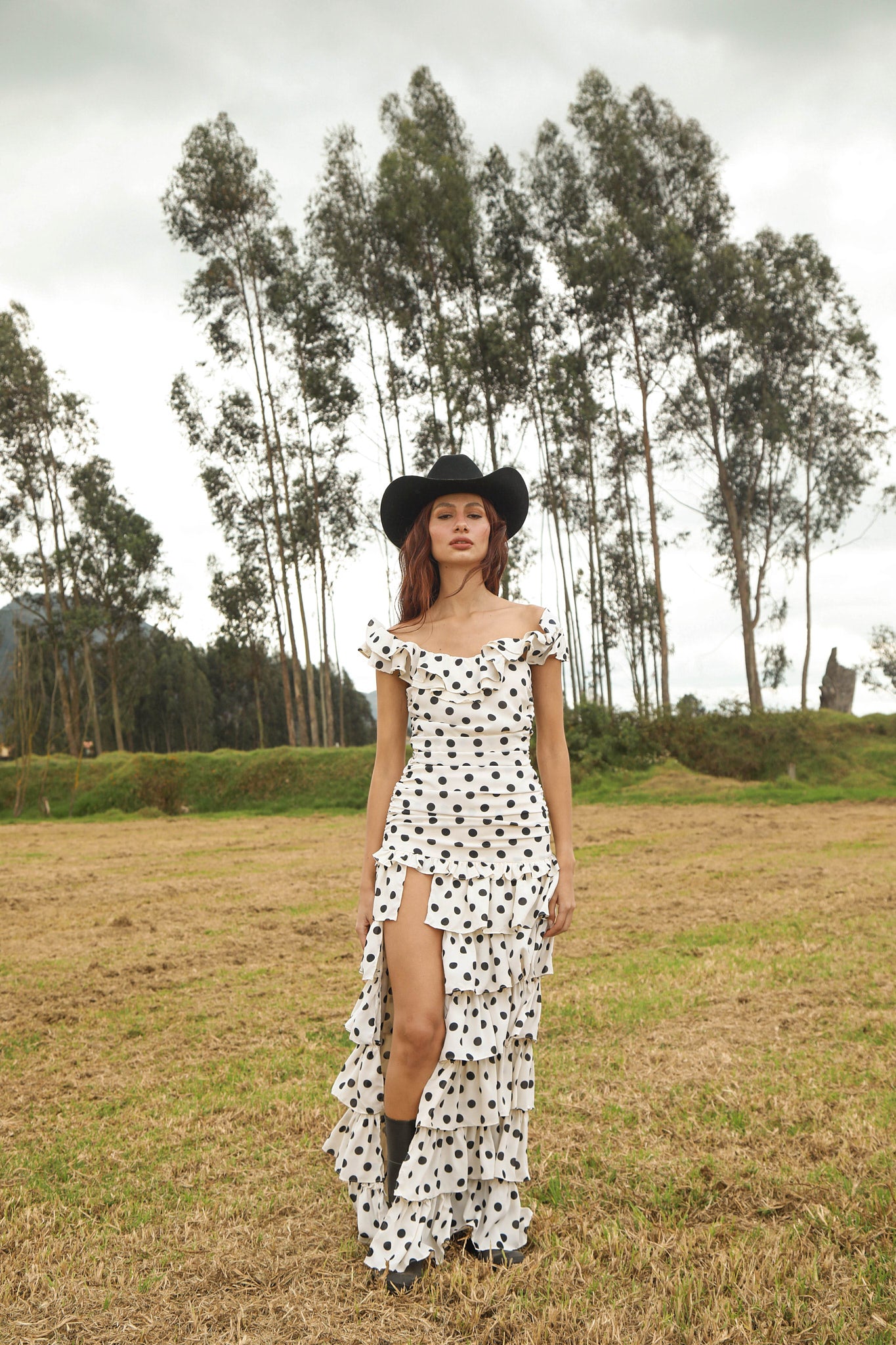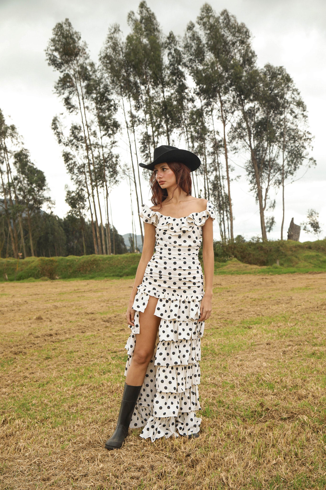 VESTIDO LARGO BLANCO DE PUNTOS NEGROS